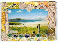 This little book is made from brown money envelopes & luggage tags. The tags fit perfectly inside the envelopes which have been stamped with Versamagic inks.
